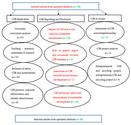 As depicted in Figure 3, the articles of this review were classified into three themes to facilitate the analysis within the selected timeframe and databases of the study. Most of the articles found in this review discussed the CSR implications for the HEIs curriculum, CSR disclosure in terms of ethics and social value, and the integration of ethics, CSR and sustainability. Others focused on CSR in action as an interaction of CSR and entrepreneurship. With respect to the theme of CSR’s implications and disclosure, twenty-seven articles published during 2004–2020 were focused on teaching initiatives, assessments and research (n = 11), the inclusion of ethics, CSR, sustainability and barriers of implication (n = 10), and the relationship between a firm’s CSR practice and corporate effectiveness and student attractiveness (n = 6). In contrast, twenty-four articles published during the study period were based on CSR reporting and disclosure as an interaction of CSR, altruistic motives towards socioeconomic development, ethics, and the enhancement of sustainable development (n = 20), and the role of quality management and the accountant as regards reporting (n = 4). Furthermore, just seven articles have been published during the study period were focused on CSR into action, and covered CSR project analysis and the interaction of CSR and entrepreneurship. These results are comprehensively in line with the results revealed by Ref. [51], who provided an SLR of sustainability reporting in HEIs during the 2000–2014 study period, whereas Ref. [24] investigated the higher prevalence of general university curriculum analysis during the review of sustainable development in HEIs in the 2005–2014 study period. The evidence concludes that the ethics, sustainability and CSR curricula analysis topics were more prevalent than CSR disclosure and CSR in practice in HEIs.