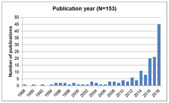 Relevant literature was identified by using the combined search string “TITLE (agri* OR agro* OR farm*) AND TITLE-ABS-KEY (sustainab* W/3 (transition* OR transformat*)) AND (LIMIT-TO (DOCTYPE, “ar”) OR LIMIT-TO (DOCTYPE, “re”) OR LIMIT-TO (DOCTYPE, “ip”))” in the database Scopus. The search yielded 197 results (10 April 2019). After screening all abstracts, the number of papers considered in this review was limited to 153 according to the following exclusion criteria. Literature without relevance for this article’s topic on sustainability transitions or transformations in agriculture, not available in full text, or written in a language other than English or German were excluded. The sample was limited to literature published until the year 2018 (including literature published first online in 2018 with an “in press” status by the date of the search). The review has a global scope. A list of all considered publications can be found in Appendix A.