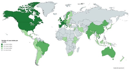 Overview of local case studies (N = 138). Some further empirical studies refer to continents (Africa (1), Asia (1), Europe (3)) or regions (European Union (2)). Multiple counts per paper possible.