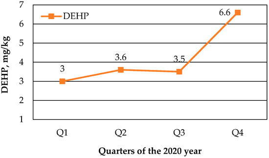 The DEHP concentration increased twice during the year. The analysis of the data presented in Figure 1 showed that the amount of phthalates in the sludge has a tendency to change during the year, but there is no seasonal relationship [73]. The main reasons for an increase in the concentration of DEHP in sludge depend on the quality of wastewater, especially its industrial component, the type of treatment facilities and their efficiency.