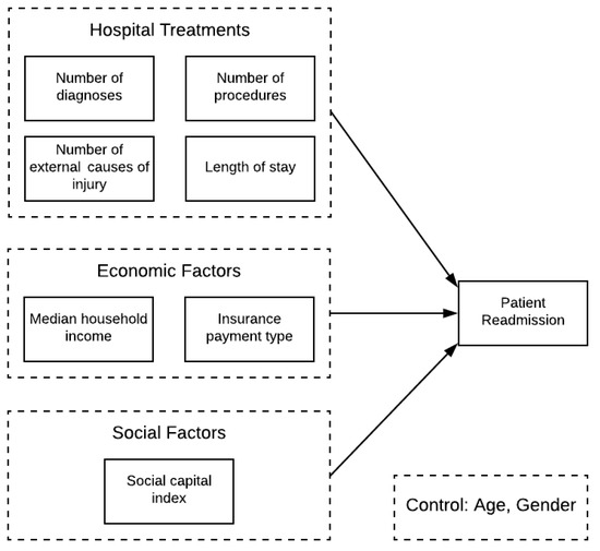 From the patient’s visit date and length of stay, a calculation was made as to whether the visit was readmission within 30 days of last visit discharge. This gave a primary outcome variable for hospital readmission (1/0 indicator). The independent variables come from three groups: Hospital treatments, economic factors, and social factors, with demographics as control variables.