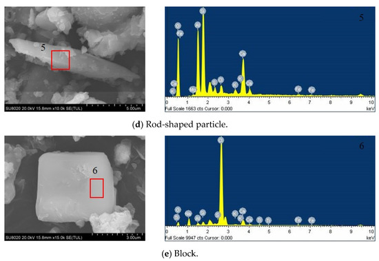 SEM micrographs of fly ash particles: (a) Spherical particle; (b) Irregularly shaped polymer; (c) Bar polymer; (d) Rod-shaped particle; (e) Block.