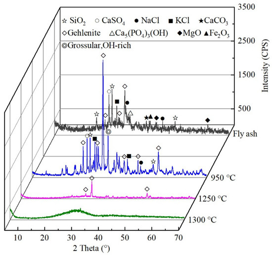 The mineral transformation behavior of the fly ash during the melting process is complex. Figure 3 shows the phase characterizations of the raw fly ash and the heated slag at 950 °C, 1250 °C, and 1300 °C in order to obtain the mineral transformation behavior.