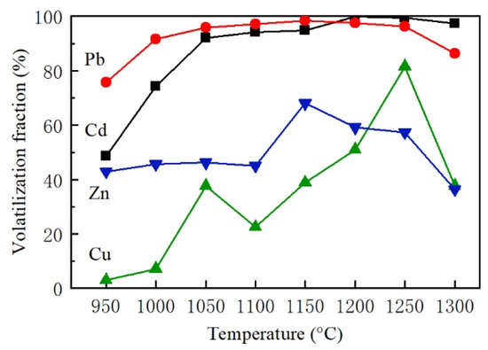Cd and Pb volatilize more easily than Zn and Cu, as shown in Figure 4. The volatilization fractions of Cd and Pb at 950 °C were 48.5% and 75.7%, respectively, and they increased rapidly to 92.0% and 95.8% at 1050 °C, respectively. As the temperature increased, the volatilization of Cd and Pb slightly increased. When the temperature reached 1200 °C (>HT), the volatilization of Cd and Pb decreased. Cd and Pb are mainly in the form of volatile chlorides and oxides in the MSWI fly ash [31,32,33], but these were quickly removed. Therefore, it was not easy to react with minerals to form stable compounds at high temperature.