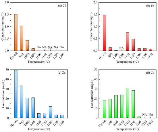 Figure 5 shows the leaching concentrations of Cd, Pb, Zn, and Cu from the fly ash and heated slag. In the raw fly ash, the concentrations of Cd (1.51 mg/L) and Pb (1.49 mg/L) exceeded the limits of the Chinese standard GB16889-2008 (Cd: 0.15 mg/L; Pb: 0.25 mg/L) [36]. Therefore, fly ash cannot be disposed in a landfill without further treatment. When the heating temperatures were below 1200 °C, the leaching concentration of Cd, Pb, Zn, and Cu varied greatly as the temperature increased. When the temperature increased above 1200 °C, the leaching concentration of Cd, Pb, Zn, and Cu decreased significantly. This indicates that the formation of liquid slag at a high temperature improved the stability of the heavy metals in the products and reduced the migration of Cd, Pb, Zn, and Cu. This means that the stability of heavy metals in the glass slag was greater than that in the sintering slag.