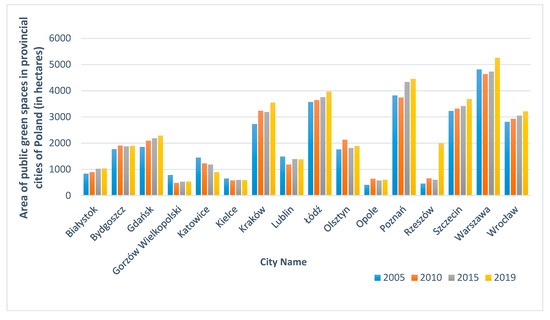 - Area of public green spaces in individual cities in Poland in 2005–2019;