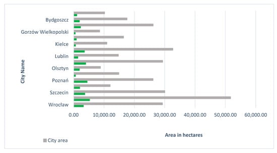 Figure 2 illustrates the area of provincial cities and the area of public green spaces contained in the database of the Central Statistical Office. The largest Polish city, Warsaw, which is at the same time the capital of the state, covers an area of over 51,000 ha, while public green spaces cover 5255 ha, which is just over 10%. The second largest city, Krakow, which will be analysed in detail later, with an area of 32,685 ha, has 3552 ha of public green spaces, which constitutes 10.9% of its total area. The highest ratio of over 21% is achieved by the relatively small city of Olsztyn, located in one of the country’s least populated provinces.