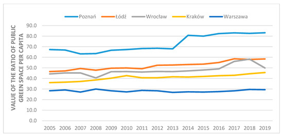 Figure 3 illustrates the changes in the ratio of public green space per capita during the period 2005–2019. It is clearly visible that the worst result was achieved by the largest Polish city and at the same time, the capital of Poland, inhabited by nearly 1.8 million people. In 2005, the ratio was 28 m²/inhabitant, and after 14 years in 2019 it had only increased to 29 m²/inhabitant. The second largest and most populous city in Poland—Krakow—achieved slightly better results. Here, the ratio in 2005 was 36 m²/inhabitant, which by 2019 had increased to 46 m²/inhabitant. Poznan stands out among the largest cities in Poland, as it has visibly improved the quality of life of its inhabitants. Here, the ratio of public green spaces per capita in 2005 was as high as 67 m², and this ratio had increased to 83 m² in 2019.