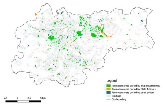 The statistical data analysed in Section 3.1 do not provide a complete picture of the green space in Krakow. Therefore, it was decided to perform a detailed analysis illustrating not only its area, but also its distribution. The data were acquired from the National Geodetic and Cartographic Documentation Centre, which includes land registry/cadastral data. The land included in the resource is assigned a type of land use—agricultural land, forests, wooded land, recreation and leisure areas, residential areas. There is no use called “green spaces” that would correspond to the definition contained in the Nature Conservation Act [60]. Figure 4 illustrates the distribution of recreation areas in Krakow, which cover most of the areas indicated in this definition. In accordance with the Regulation on the register of land and buildings [62], recreation areas include undeveloped land and related facilities:
