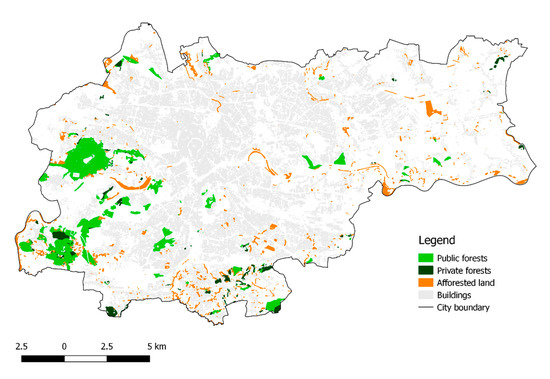 Recreation areas are not the only green spaces included in the statistical data of the Central Statistical Office. A significant area is also occupied by trees. Figure 5 illustrates the distribution of forests and afforested land (woodland) in Krakow. Public forests and private forests are marked in different colours.