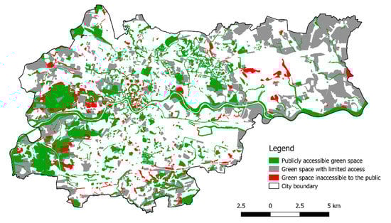 As mentioned before, the publication [16] presents the problem of including the selected but not precisely defined greenery in the statistical data. According to the authors [16], the amount of green spaces in the analysed city significantly exceeded the statistical data. However, this study also included agricultural land as green spaces. Agricultural land is largely private property and cannot be equated with public greenery, which is included in the statistical data. The results of the above research pointed to the need of developing the additional categorisation of green spaces in cities that would take access to these spaces into consideration. Therefore, the authors of this research paper analysed the accessible data and prepared a map of the greenery in the city of Krakow that took the accessibility factor into account.