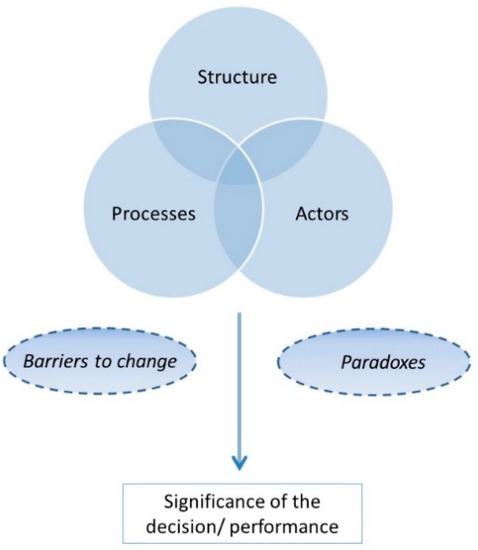 Consequently, our study is precisely focused on the need for municipalities to seek, supply, and guarantee new structures and effective models of cooperation, which bypass the traditional hierarchal organization of authority [32]. Hence, we used an adaptation of the framework (Figure 1) of analysis developed by Vangen et al. [33]. They distinguished three main factors, i.e., structures, processes and actors. Structure is a complex system of interconnected elements which determines the definition of ties and opportunities according to which actors can operate and influence the distribution of power and resources, the agenda setting, the decision-making models, etc. Briefly, talking about structure in connection with the theme of intermunicipal cooperation, means to refer to elements such as the complexity of the relationship among actors and the number and size of municipalities. In particular, it is interesting to ask if complexity is based on a system of weak or strong ties. A second characteristic of structure complexity is the number and size of municipalities; this has an effect on the costs and benefits of cooperation because it involves both the resources that municipalities control and the power exerted by them, according to their size [34,35]. The process aspect is connected to the way in which coordination takes place, how actors cooperate, communicate, make decisions, and share responsibilities. Obviously, the processual dimension is very dynamic and can take different shapes, also within the same governance network, the implication being that some processes can strengthen one actor and damage others, while others provide win-win solutions for all the different actors. Here, the reference is to non-structural relationships that useful for promoting interorganizational collaborations (both formal and informal) such as joint projects, workshops, convening committees, routinized working cooperation, etc. Here, we encounter both formalized mechanisms such as information, coordination, and control mechanisms, and less formalized and “soft” mechanisms [36,37,38]. Finally, when the reference concerns actors, the attention is on a wide array of subjects which include both institutional and non-institutional subjects, for example, politicians, bureaucrats, administrative staff, experts, citizens, associations, and the third sector, as well as profit and non-profit organizations. Furthermore, this heterogeneity finds a straightforward confirmation in the presence of power asymmetries and differences that can pertain both to the organizational level and to the individual partners. Differences in interests and informal relationships can frequently lead to collaboration that does not work in the expected manner, and that is why the presence of leadership that is able to foster trust and cooperation among actors is so important [39,40]. According to Crosby et al. [41], there are four leadership roles, i.e., sponsors, champions, catalysts, and implementers. Finally, our framework must be completed by an evaluation of the performance. Kenis and Provan [42] (p. 442) stated that it is complicated to answer the question “what is performance?” in public networks and ask how performance should be measured. Furthermore, it is essential to consider that in interorganizational collaborations new actors can take the stage and others may leave, thus, weakening the trust level within the network, or a new policy may impinge on what has previously been done, thus, limiting the effectiveness of those choices. Accordingly, much of the research on intermunicipal arrangements have emphasized that the failure of local governance efforts is a more likely alternative to success [43]. For these reasons, we decided to consider performance as the so-called significance of a decision [1]. An act can be defined as a decision if none of the significant actors and partners involved in that decision defect or sabotage the effectiveness of that decision [44]. Finally, along this process it was possible to identify a series of barriers and paradoxes that could be obstacles to successfully reaching a new arrangement.