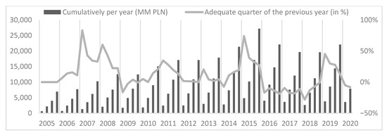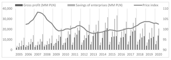 In light of the method presented here, which is based mainly on the theory of economic dynamics, we adopt the following mechanism of shaping the gross investment value in the energy sector in Poland. Gross investment at time is a positive function of gross savings and changes in gross profits to the price index . Since investments in the Polish energy sector are mainly carried out by contractors from the construction and engineering industries, in our research we adopted the price index for construction and assembly production. Moreover, we adopted the following variables for the calculations. These are gross investment outlays and gross profit. We calculated the remaining values according to the adopted method. All changes in the analysed values were calculated as relative changes to the corresponding quarter of the previous year (QoQ_PY). In our research, we adopted the time perspective from 2005 to 2020. Due to the availability of data during the study, the last period analysed is the 2nd quarter of 2020. We have adopted a long time perspective. This is since we wanted to verify the validity of the base formula (formula 3) during several business cycles.