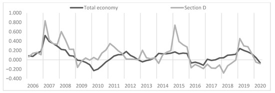 In this part of the paper, we present the results of our research. The analysed data come from Statistics Poland and are presented quarterly. First, we present data that reveal the level of investment outlays in the Polish energy sector (in PLN million) and their relative change as compared to the corresponding quarter of the previous year (in%) (see Figure 1). For a better overview of the gross investment situation in the Polish energy sector, we also present the dynamics of their changes. Here, we present the data for section D against the background of the entire Polish economy. The quarterly dynamics of changes in investment outlays presented in Figure 2 was calculated as a relative change to the corresponding quarter of the previous year.