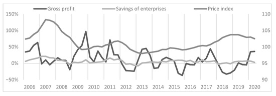 On the next chart, we present the main factors of gross investment in enterprises. (see Figure 3) According to the method described above, these are gross profit, gross savings of enterprises and the price index of construction and assembly production in Poland. Data for the last factor are available from the 1st quarter of 2006. Also, in this case, it is worth presenting the dynamics of changes in these data (see Figure 4). Concerning gross profit and gross savings of enterprises, we used the relative change in quarterly values compared to the corresponding quarter of the previous year. We present the price index here as primary values.