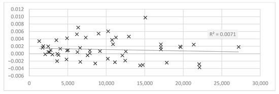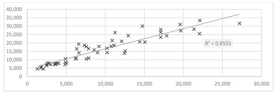We also calculated the linear regression and the correlation coefficients for variant 2. In this case, we assumed the delay . This means that for the dependent variable we assumed the period 1Q 2008–2Q 2020 and for the independent variables 1Q 2006–2Q 2018. It turned out that the results for this delay are very consistent with the results of variant 1. The regression statistics for variant 2 looks as follows. The Multiple R correlation coefficients is 0.9019, the R-Square coefficient is 0.8134 and the Adjusted R-Square is 0.8055. Here, the results were calculated for 50 observations (quarters). Standard error reached 2831.1329. Detailed data of linear regression calculations are presented in Table 2.