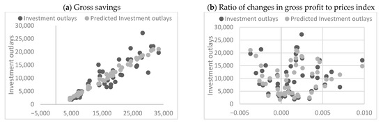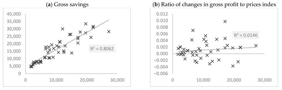 Also, in this case, the coefficient is smaller than 1. It is also slightly smaller than the value from variant 1. Below we present only the model fit charts for individual independent variables. (see Figure 9) These results also confirm a very strong convergence with the results for option 1. Still, the gross investment of enterprises is very strongly dependent on the level of gross savings. The second independent variable is again characterized by a very weak influence on the dependent variable. The justification for these results can also be found in the analysis of the correlation between gross investments with a delay of with each of the independent variables. These results are presented in Chart 10 with each of the independent variables. These results are presented in Figure 10. Again, we can see the already known relationship. The dependence of the level of gross investment on gross savings of enterprises can be described by the R-Square coefficient of 0.8062 and the Pearson correlation coefficient of 0.8979. In turn, the correlation between gross investment and the ratio of changes in gross profits to the price index is characterized by an R-Square factor of 0.0146 and a Pearson’s of 0.0786. There is a slight difference between the corresponding results for variant 1. Comparing the calculations for two variants, one conclusion can be drawn. The model fit for gross investments in the Polish energy sector is stronger assuming a delay of . However, this fact does not depreciate the delay . Calculations for each variant confirmed the theoretical assumptions of the model, which is based mainly on the theory of economic dynamics by M. Kalecki.
