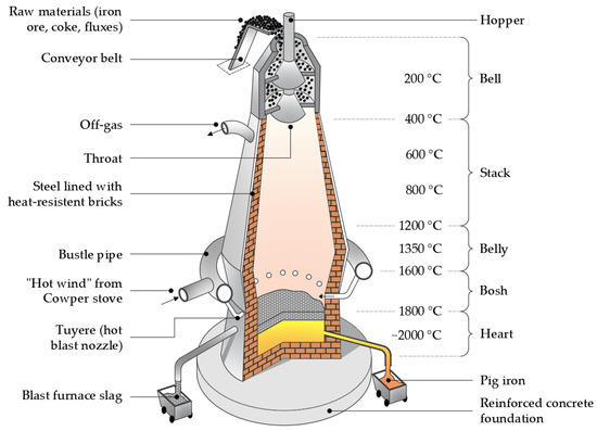 Pig iron production takes place in a blast furnace (Figure 1). It is a 30–40 m high structure made up of an external steel armor internally coated with refractory bricks able to withstand high temperatures. Near the blast furnace there are three or four Cowper’s towers which are used to collect and filter the fumes emitted (these fumes will then be reintroduced into the structure). The raw materials (iron ores, coke, and flux (mainly limestone)) are placed on the conveyor belts that take them to the highest part of the structure, where there is a special opening for their insertion. Simultaneously with the insertion of the raw materials from above, there is a blowing of hot air (called “hot wind”) from below, through special tubers. This hot wind comes from the previously mentioned Cowper’s towers. The oxygen contained in the hot wind (with a possible external enrichment) reacts with the carbon of the coke generating reducing gas, rich in CO (carbon monoxide), which invests the loaded material from below and exercises the reducing action against the iron oxides contained in minerals. The reduced part (Fe) melts and settles in the crucible where the carburation takes place (solution of carbon in the molten mass) generating the pig iron. Not all the carbon monoxide reacts in this way; a part will remain with the fumes that come out, i.e., blast furnace gases. The calcination of the flux present in the charge gives rise to a calcium oxide which, together with the waste substances of the iron ores (called “gangue”) and the ashes of the coke, forms the blast furnace slag. This is collected in the crucible in a floating layer over the pig iron bath. In addition to neutralizing the acid component of the minerals, the slag allows the absorption of sulfur and other impurities contained in the raw materials and unwanted in the pig iron.