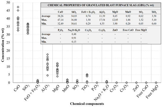 Table 2 summarizes the physical properties of the blast furnace slag (both GBS and ABS) from the literature. Given that around 80% of blast furnace slag production in Europe is made up of GBS and the remaining 20% of ABS (with a drop to about 13% in 2018 [13]), this document focuses mainly on GBS slag and Figure 2 shows its chemical composition from the literature and how the concentrations of the different chemical components are distributed. However, it should be underlined that the chemical composition of ABS slag is very similar to that of GBS slag [18].