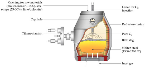 The basic oxygen furnace (Figure 3) is usually located in association with a blast furnace and is charged first with steel scraps, for maintaining the temperature at 1600–1650 °C for the chemical reactions, and then with molten iron produced in the blast furnace [28,29]. Then, a 99% pure oxygen flow is applied at supersonic speed through a lance lowered into the furnace, in order to allow oxidation reactions and the removal of impurities contained in the charge. Other fluxes (lime/dolomite) are added later and, once burned and combined with the impurities, they lead to the formation of the slag and the reduction of the unwanted chemical elements in the melt [28,29]. A small amount of molten steel is tapped and analyzed and, when its chemical composition meets the requirements, the oxygen blowing lance can be removed. The furnace is tilted on one side in order to tap the molten steel and then on the other side to allow the recovery of the slag (previously deposited in a layer over the molten steel bath) [28]. The slag produced in the basic oxygen furnace is called basic oxygen furnace slag (BOF) and there are numerous methods for cooling this type of slag, e.g., natural air cooling, air quenching, water spraying, and shallow box chilling. Depending on the cooling method used, the physical, chemical, mineralogical, and leaching characteristics of the BOF slag may change. Other physical processes can be applied to the BOF slag before their reuse (crushing, grinding, screening, sieving, magnetic separation, etc.) [29]. Table 3 shows the different cooling processes, common treatments, and reuses of the BOF slag.