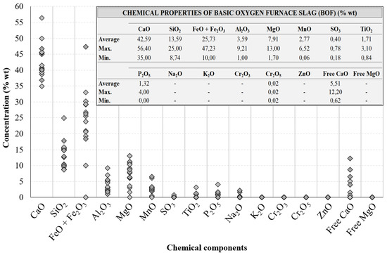 Figure 4 shows the chemical composition of the basic oxygen furnace slag from the literature and how the concentrations of the different chemical components are distributed.