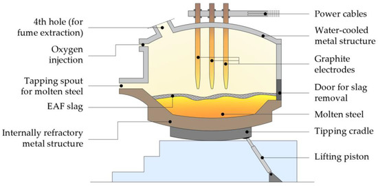 The steel production with electric arc furnace (Figure 5) does not depend from the production of pig iron in the blast furnace; in fact, the charges are made up of steel scraps and other secondary materials in smaller quantities (first, pig iron and CaO in the form of burnt lime or dolomite; subsequently, small quantities of oxygen and carbon powder). These raw materials are loaded from the top of the furnace after being separated, graded, and sorted [28]. The quality, density, and size of the charged materials must be carefully chosen for two reasons: the melting and temperature conditions inside the furnace and the chemical composition of the finished steel must be in the required ranges. For the fusion, three graphite electrodes are lowered into the electric arc furnace; then, an arc transformer is struck and the electricity travels through the electrodes and the steel scraps, melting them and generating heat [28]. During the oxygen injection, some iron and other impurities (aluminum, manganese, etc.) are oxidized and, combined with CaO, form the electric arc furnace slag (EAF). This slag is collected over the molten steel bath and is tapped by tilting the furnace on one side, while for the recovery of the molten steel, the furnace is tilted in the opposite direction.