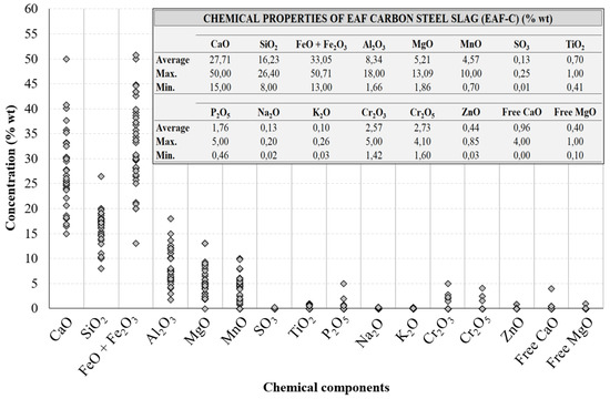 Figure 6 shows the chemical composition of the electric arc carbon steel furnace slag (EAF-C) from the literature and how the concentrations of the different chemical components are distributed.