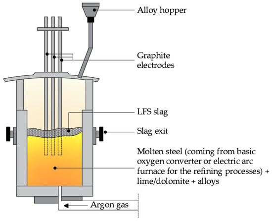 Steel produced in a basic oxygen furnace or in an electric arc furnace usually goes to refining processes in the ladle furnace (secondary processes). This furnace (Figure 7) looks like a smaller version of the electric arc furnace, with three graphite electrodes used to heat the steel [28]. The refining processes in the ladle furnace are: