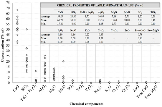 Figure 8 shows the chemical composition of the ladle furnace slag from the literature and how the concentrations of the different chemical components are distributed.