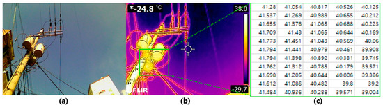 In order to collect accurate temperature from objects by using a thermal camera, various conditions such as the background of the image, surface status of the objects, weather conditions, and thermocouple should be considered while acquiring IRT images [32]. In the preprocessing stage, a labeling process is performed to train object detection models. The label of an image includes an object’s bounding box coordinate information and the type of object for each image. FLIR T660 provides the original image of the target and thermal data of every pixel in the IR image also (Figure 3). In this experiment, RGB represented IR images are employed to train the deep learning algorithm. Once the algorithm detects the objects, then the methodology matches the thermal data to corresponding coordinates.
