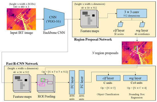 To process the input IRT image with Faster R-CNN, there are two stages that need to be performed (Figure 4). The architecture of the Faster R-CNN detection pipeline is shown in Figure 4. The input IRT image with a size of 640 (width) × 480 (height) × 3 (RGBs) is first passed through the backbone CNN to obtain the feature map. A CNN applies VGG-16 (very deep convolutional networks for large-scale image recognition), which is easy to accumulate in layers. Faster R-CNN creates a computational advantage by sharing the weights of the feature map from the backbone CNN with the RPN and Fast R-CNN networks as the detector network [33]. The output features of the backbone CNN depend on the stride of the backbone network. The VGG-16 network has a stride of 16; therefore, the feature map is output with a size of 40 (width) × 30 (height) × 512 (dimension). The RPN produces N region proposals (Figure 5). The region proposals pool features from the backbone feature map: ROI pooling layer. This layer divides the features from the region proposal into sub-windows and performs a pooling operation in each of these sub-windows. This brings out fixed-size output features of size N × 7 × 7 × 512, where N is the number of region proposals. These output features are reflected in the fully connected layer (FC layer), the classification layer (clf layer) with Softmax, and the bounding-box regression layer (reg layer), respectively, in the Fast R-CNN network (Figure 4). The classification layer with Softmax produces the probability values of each ROI belonging to categories. The bounding-box regression layer output is used to set the coordinates of the bounding box. The classification layer in the Fast R-CNN network has C units for each class in the detection task. Each class has an individual regressor with four parameters, hereby corresponding to C × 4 output units in the regression layer.
