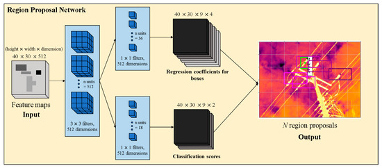 An RPN takes a feature map as input and outputs a set of rectangular region proposals and objectness scores. The architecture of the RPN is shown in Figure 5. In order to generate region proposals, the RPN slides a network over the feature map output by the VGG-16. This network is fully connected to a 3 × 3 spatial window of the input feature map. Each sliding window is mapped to a lower-dimensional vector (512-d for VGG-16). This vector is inserted into each box-regression layer and a classification layer, respectively. ReLUs (Rectified Linear Unit) are applied to the output of the 3 × 3 convolutional layer. At each sliding window, the network predicts k region proposals. Therefore, the box-regression layer has 4k outputs encoding the coordinates of k boxes, and the classification layer has 2k output scores on an object or not-object. The k proposals are parameterized connections to k reference boxes, which are called anchors. Each anchor is centered at the sliding window. The anchor is related to three scales (8, 16, 32) and three aspect ratios (0.5, 1.0, 2.0), hereby resulting in k = 9. For a feature map of size W × H, the RPN predicts W × H × k anchors. In this experiment, 40 × 30 × 9 anchors were created for each feature map. The 36 units in the box-regression layer give an output of size 40 × 30 × 9 × 4 (Figure 5). This output is used to give the four regression coefficients of each of the nine anchors for every point in the backbone feature map of size 40 × 30. These regression coefficients are employed to improve the coordinates of the anchors that include objects. The 18 units in the classification layer give an output of size 40 × 30 × 9 × 2 (Figure 5). The output is used to predict the probability that each point is in the backbone feature map.