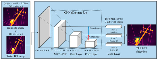 In this note, the original IRT image is resized to a scale of 416 × 416 pixels with the RGB colors. YOLOv3 adopts a multi-scale prediction similar to a feature pyramid network (FPN); the initial output size of 416 × 416 downsizes to 208 × 208, then 104 × 104, until it reaches 13 × 13 (Figure 6). In order to make predictions on a multiple-scale feature map, YOLOv3 needs to acquire image features at different scales, which greatly improves the detection of objects. The final three feature maps are formed by combining three feature maps with sizes of 52 × 52, 26 × 26, and 13 × 13. The feature map is transmitted to the three adjacent scales using up-sampling twice. As a result, each cell at each feature map predicts three bounding boxes. For each bounding box, the YOLOv3 network predicts x, y corresponding to the two coordinates of the center of the box, h and w corresponding to the height and width of the box, respectively, and c and p representing the confidence and category probabilities, respectively.