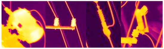 In this study, 16,843 IRT images with resolutions of 640 × 480 were collected to verify the intelligent fault detection system. The IRT image data were collected in a single snapshot under various environments and seasonal conditions. The IRT image data were all composed of power transmission facilities, and there was a difference in backgrounds caused by shadows and luminance differences over time during IRT image acquisition. Since the reflective temperature from the surrounding of the component may influence its actual temperature, the KHNP expert used the sky as a background for the images to reduce the impact of the environment (i.e., trees, land, buildings, etc.). Four component types, i.e., current transformer (CT), lightning arrestor (LA), insulator (INS), and cut-out switch (COS), were selected as components causing failure resulting from deterioration in power transmission facilities (Figure 7). Labeling the collected IRT images, a total of 93,315 objects were detected, with 2841 CTs, 11,439 LAs, 72,242 INSs, and 6793 COSs. The IRT image data were separated into training sets and test sets at a ratio of 8:2.