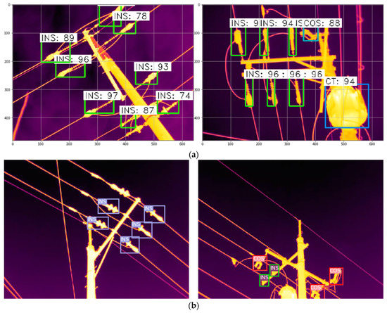 Object detection models were trained using the collected power transmission IRT images. The two models, Faster R-CNN and YOLOv3, were trained and verified with the same IRT images. Examples of detection results for both models are shown in Figure 8. Faster R-CNN recognizes the objects with identification probabilities and boxes as shown in Figure 8a. For instance, the blue square with CT:94 (bottom right) in the second picture of Figure 8a describes that the object in the box is 94% likely to be a current transformer (CT: 94).