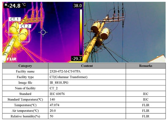 As described in Section 3, the IRT image and deep learning-based object detection models were tested for applicability to diagnostic methods. The TIAA proposed in this note presents meta information of IRT images and IEC standards as the basis for facility diagnosis. In this experiment, IRT images were obtained using FLIR T660. TIAA shows the following information from the processed IRT images of the facility: facility name, facility type, IRT image file name, number of facilities within image, IEC standard for the facility, maximum temperature, emissivity, air temperature, and relative humidity. An example of the results of the TIAA is shown in Figure 9.