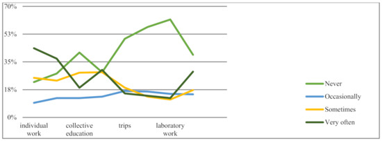 The subject taught also influenced the choice of another form of education for developing creativity—laboratory work. This form is most often used by teachers of natural and exact sciences (Table 8).