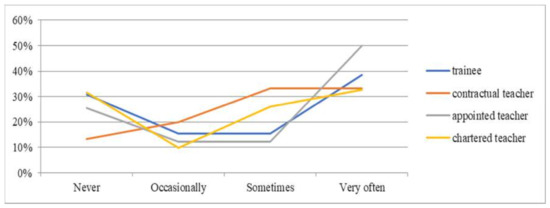 The analysis of the results implies that drama—as a method to develop creativity in students—is used mainly by the trainee teachers who have just begun their careers. Similarly, only trainees and contractual teachers use the modern teaching method Webquest. Trainees also declared they used methods like metaplan (15.38%) or educational project (15.38%) to develop creativity among their students. Curriculum discussion is used at a similar level. Brainstorming, in turn, is preferred by the teachers with higher degrees of professional promotion (trainees—15.38%; contractual—31.11%; appointed—21.95%; chartered—20.41%).