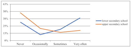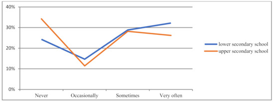 The stage of education turned out to be another statistically relevant variable in choosing homework. This form was chosen most often by teachers of upper secondary schools (Figure 3).