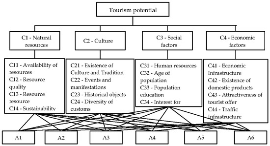 22]. Four main criteria were selected: natural resources (C1), culture (C2), social factors (C3) and economic factors (C4) (