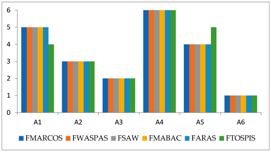 Figure 3) have shown that the results differ within the fuzzy TOPSIS method, where alternatives A1 and A5 replaced the ranking order. Other alternatives have kept the same ranking. Thus, it has been proven that the ranking order obtained by the fuzzy MARCOS method does not differ from the ranking order obtained by applying other fuzzy methods.