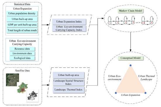 Multi-source datasets were collected and trimmed to carry out this investigation (Figure 1). These datasets included statistical socio-economic data, climate and ecological observation data, and remote sensing data. Social-economic data, such as demography, industry, and civil infrastructure, were used to calculate the urban expansion index. These datasets, including natural resources, environmental quality, and ecosystems, were used to calculate the resource–environment–ecology carrying capacity index. These datasets were from the Beijing Statistical Yearbook and China City Statistical Yearbook (1984–2018). Satellite datasets, including the Normalized Difference Vegetation Index (NDVI) and LUCC (Landsat, resolution of 30 m) and surface temperature (MODIS Aqua, resolution of 1 km, 8 Days), were used to detect land use cover changes, urban built-up areas, the quantity of infrastructure construction, and the temperature in the urban area.