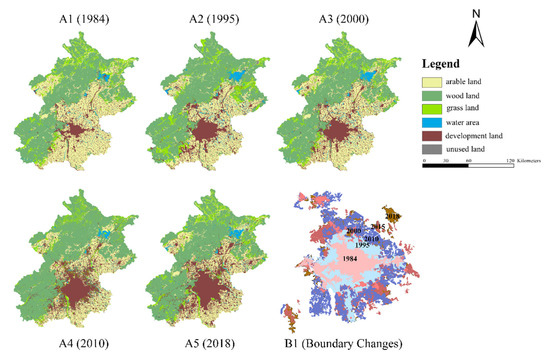 Map of urban expansion and land use change of Beijing (1984–2018). (A1–A5): Land use change of Beijing during 1984–2018; (B1): The process of urban expansion from 1984 to 2018.