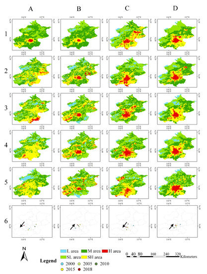 Spatial distribution of urban thermal landscape in Beijing during 2000–2018. A–D: Winter (February, when the monthly average temperature is the lowest) daytime, winter night, summer (August, when the monthly average temperature is the highest) daytime, summer night; 1–5: urban thermal landscape map in 2000, 2005, 2010, 2015, and 2018; 6: barycenter trajectories of high-temperature land area in different seasons; L, SL, M, SH, and H represent low temperature, secondary low temperature, medium temperature, secondary high temperature, and high temperature, respectively.