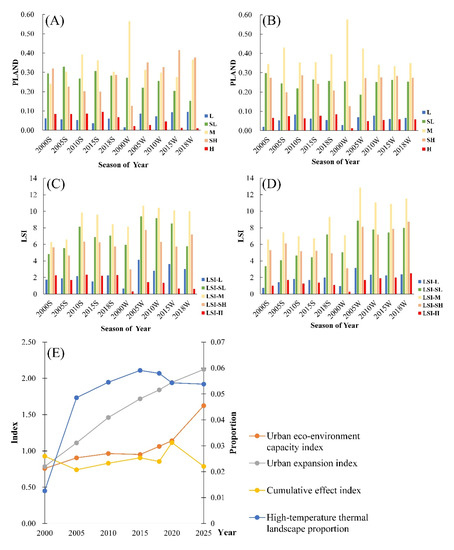 Urbanization impacts on environment quality, thermal landscape, and eco- environment carrying capacity of Beijing during 2000–2018. (A): landscape type proportion (PLAND) of daytime thermal landscape; (B): PLAND of night thermal landscape; (C): Landscape Shape Index (LSI) of daytime thermal landscape; (D): LSI of night thermal landscape; (E): estimation of four indices by the Markov Chain Model.