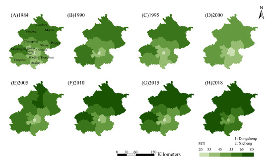 The environmental carrying capacity clearly illustrates that the relationship between urbanization, the thermal landscape, and environment quality, and the environmental carrying capacity of Beijing fluctuated dramatically during the urban expansion period. The spatial pattern of ECI in Beijing showed a prominent environmental gradient (Figure 5). From the urban central area to the suburbs, ECI presented a growing trend, and the regions with better ecological environment concentrated in the mountainous area in the northwest of Beijing had the highest ECI compared with other districts, while Xicheng and Dongcheng, located in the central area, presented the worst eco-environment. From 1984 to 2000, the urban environmental carrying capacity declined rapidly, which was closely related to the deterioration of urban air quality and the water environment. Since 2000, the environmental carrying capacity has presented a continuous growth as the Beijing government intensified efforts aimed at environmental governance and paid increased attention to improving air quality. From 2005 to 2008, due to hosting the 2008 Beijing Olympic Games, the government attached great importance to improving the urban environment. The environmental carrying capacity significantly increased. Moreover, since 2008, because the government has issued drastic protection measures and related policies to improve the urban environment, the environmental carrying capacity of Beijing has maintained a stable growth.