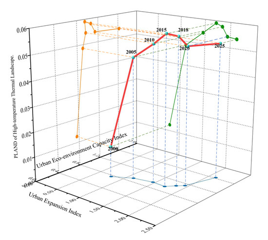 Based on the Markov Chain Model, we utilized the urban expansion index (UCI), urban ECI, resource–environment–ecological pressure accumulation index and the PLAND of high-temperature thermal landscape area (PHLAND) in 2000 as the initial state matrix (i.e., X (0) = (0.78, 0.76, 0.93, 0.013). The average transition probability matrix of each index was calculated from each index (every five years from 2000 to 2015). The matrices were used to predict the four indexes during the period 2020–2025 (Figure 4). The state matrixes in 2020 are X (5) = (1.94, 1.14, 1.12, 0.054) and the state matrixes in 2025 are X (6) = (2.12, 1.62, 0.79, 0.053). The annual growth rate of the urban expansion index drops from 8% from 2000 to 2005 to 1.6% from 2020 to 2025. The results showed that in 2020 and 2025, the increase in the urban expansion in Beijing would be gentle since its pressure index and the ratio of high-temperature thermal landscape areas are gradually decreasing, and the index of the ecological environment carrying capacity is rising rapidly. It is noticed that the turning points of the curves did not appear at the same stage of urban expansion (Figure 6): the turning point of the UCI–ECI curve (X–Y plane) appeared in 1999 at stage II of urban expansion, while the turning point of the UCI–PHLAND curve (X–Z plane) appeared in 2015 at stage IV of urban expansion; much later than the UCI–ECI curve.