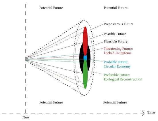 Figure 1, modified in line with Voros’s (2017) Futures Cone [41], helps to illustrate these different types of futures and their relationships. Everything beyond the present moment is a potential future. Preposterous futures refer to the “impossible” futures that we expect never to happen. Possible futures are futures that “might” happen if we gain some knowledge or skills we do not yet have. Plausible futures “could” happen, based on our current knowledge of the world. Threatening, preferable and probable futures are further discussed in this study. Preferable (and non-preferable, here described as threatening) futures are based on value judgements, what we “want” or do not want to happen. Probable futures are considered “likely” to happen. The placing of threatening, preferable and probable futures on the cone suggests that some aspects of the threats or preferences are likely to happen, some could happen and some probably never will.