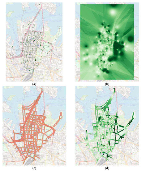 A comparison between (a) the original discrete representation of urban greenery and (b) the rasterized continuous representation after interpolation. (c) Road network of the Sydney CBD with a buffer area of 10 m width; and (d) masked representation of urban greenery based on the raster.