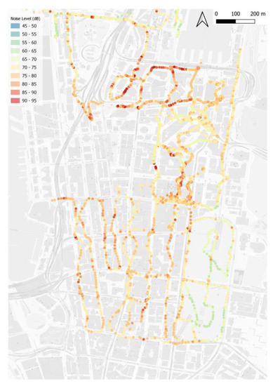 Noise mapping was initially developed in Europe and has been extensively applied and developed since the issuance of the Environmental Noise Directive [13]. More recently, there has been a growing number of initiatives that use a mobile phone-based participatory approach to measure and map noise in urban areas. This makes it possible to collect both physical sound-level data and perceptual data on the sound environment [14]. A case study of Toronto by Zou et al. [15] demonstrated that noise variability was predominantly spatial in nature, rather than temporal, and there was a high correlation between seasonal noise patterns. Noise maps can be used to identify noise levels within cities, identify areas with greater exposure, assess future scenarios, help to identify the presence of this invisible contaminant, and serve as a basis to adopt actions to reduce noise levels through structural and nonstructural measures such as sustainable urban planning [16]. As an example, Cai et al. [17] used empirical noise and traffic data to optimize a regional traffic noise estimation model and developed traffic noise maps of Guangzhou, China. Bilasco et al. [18] proposed an information system model which generated a noise map using sound measurements, building heights, land uses, a digital land altitude model, and wind speed and direction in GIS software.